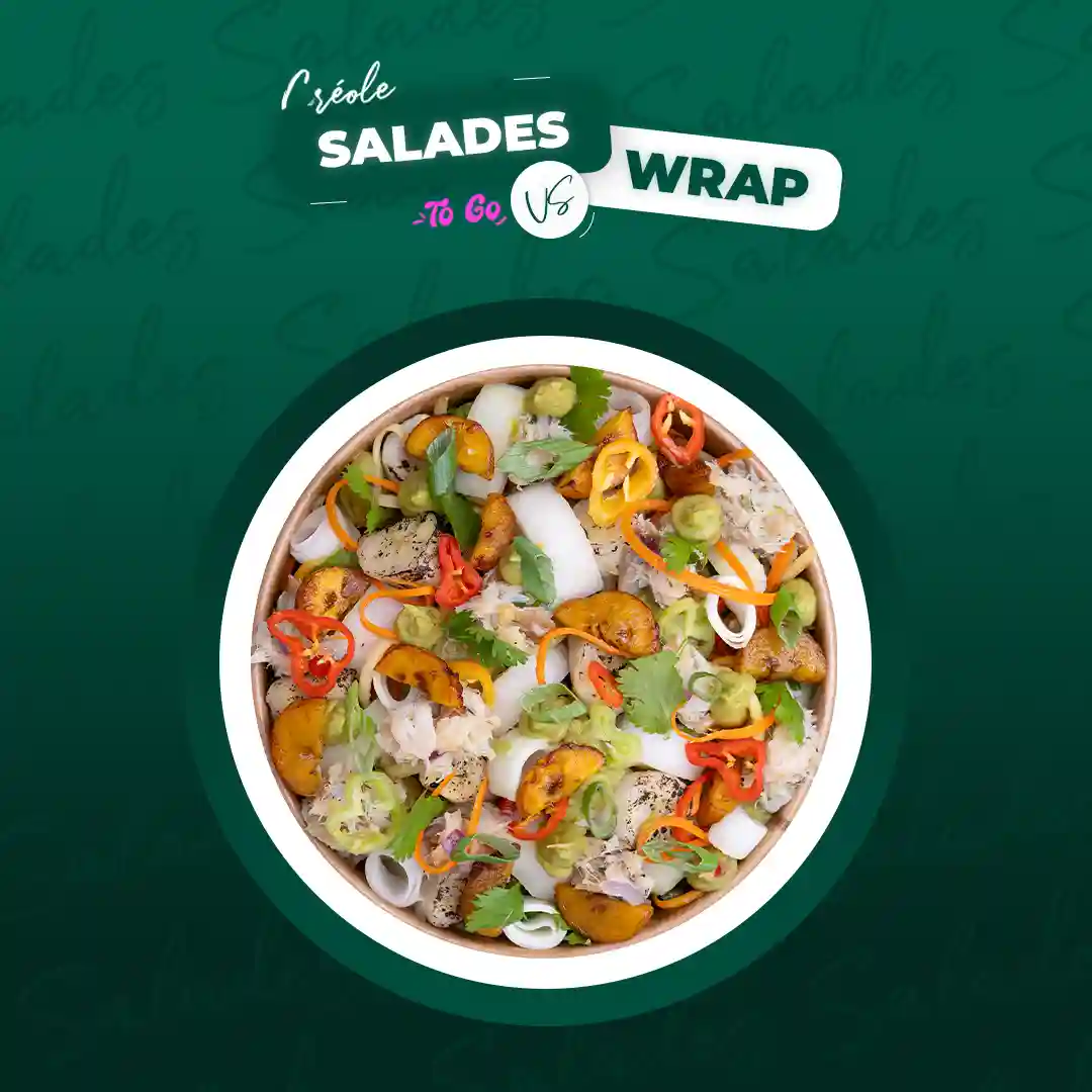 Salade fraîche, guacamole, chutney banane plantain, tenders poulet crispy, mayonnaise piment végétarien