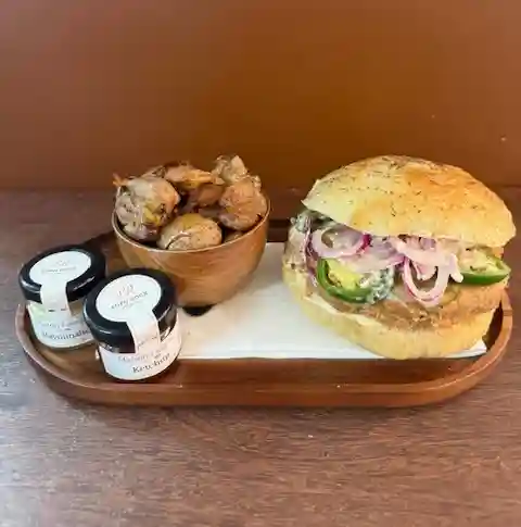 Pulled pork, mayonnaise relish, cucumber, pepper, red onion pickles with smashed potatoes or green salad