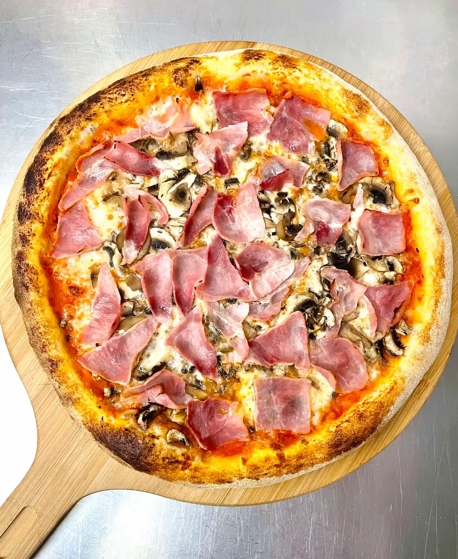 Tomato sauce, Mozzarella, White ham, Fresh mushrooms, Extra virgin olive oil, Oregano